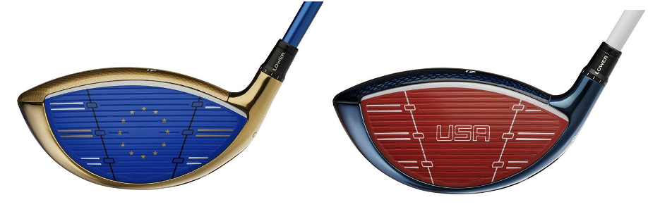 The Team Europe driver blends royal blue and gold accents with a silver/blue face and a European map graphic on the sole, while the US version features a deep blue and red colourway with a striking red face, white score lines, and a raised ‘USA’ detail, while a map of the United States is etched onto the sole.